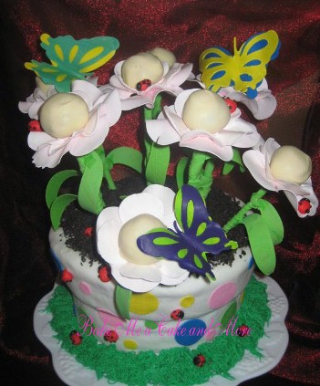 The flower pot is vanilla cake with cookies n cream filling, the flowers are cake balls with gumpaste petals, the butterflies and lady bugs are gumpaste. The “dirt” is crushed oreos.