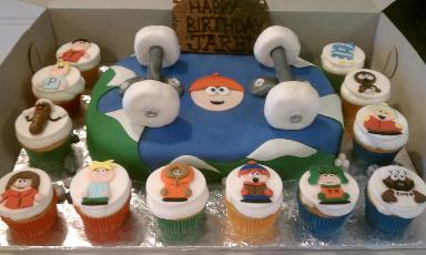 This South Park theme is amazing with all the characters showcased on each cupcake and surrounding one big cake.