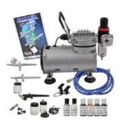 Master Airbrush Cake Decorating System. 3 Airbrushes, Air Compressor, 6′ Hose, Airbrush Holder, 3 Quick Couplers, Red, Blue, Yellow & Green- 0.7 Oz. Americolor Food Colors. Now Includes (FREE) White & Silver Shimmer Colors & How to Airbrush Training Book to Get You Started.
